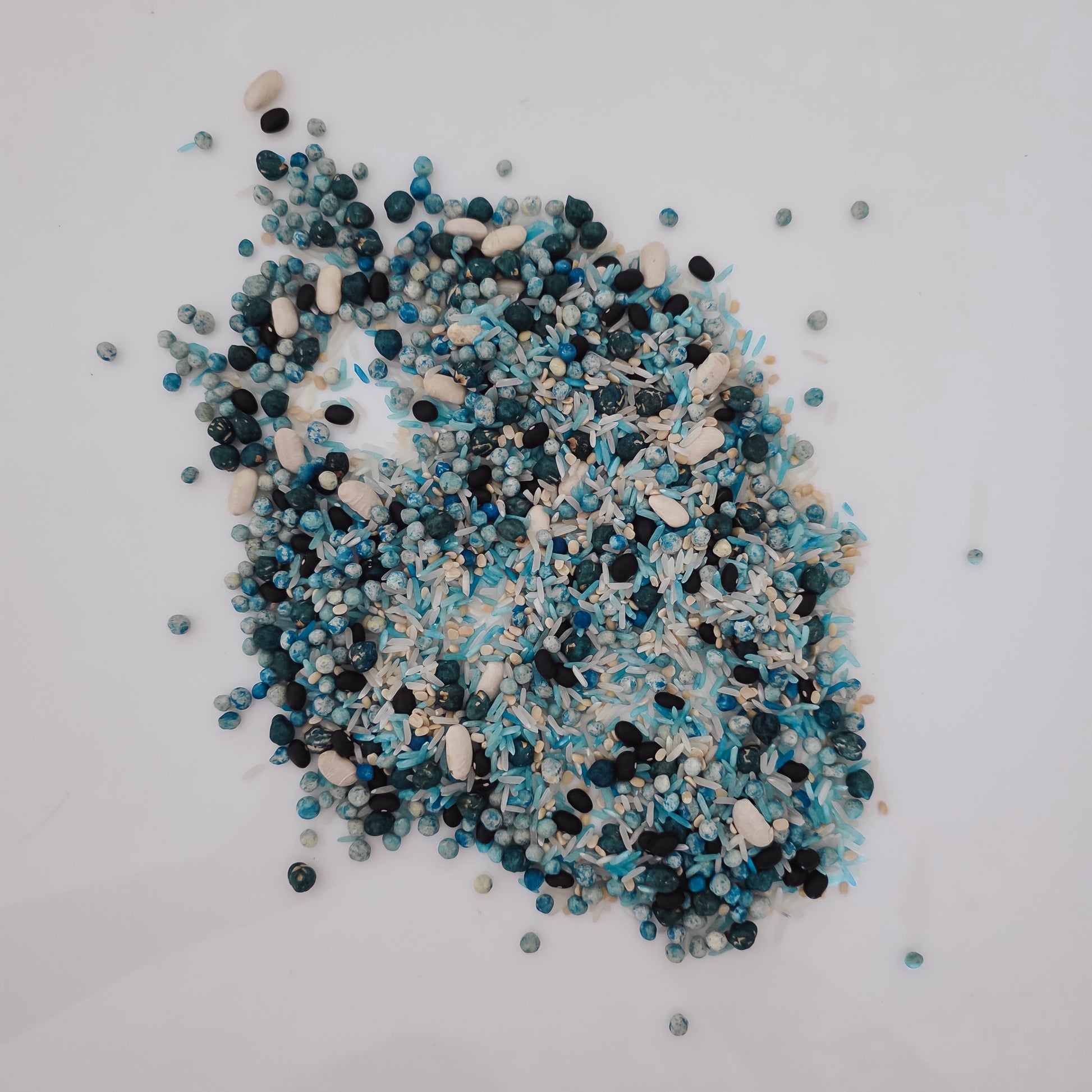 Ingredients: Long Grain Rice, cous cous pearls, chickpeas, urid dahl, beans, Food Dye and Vinegar