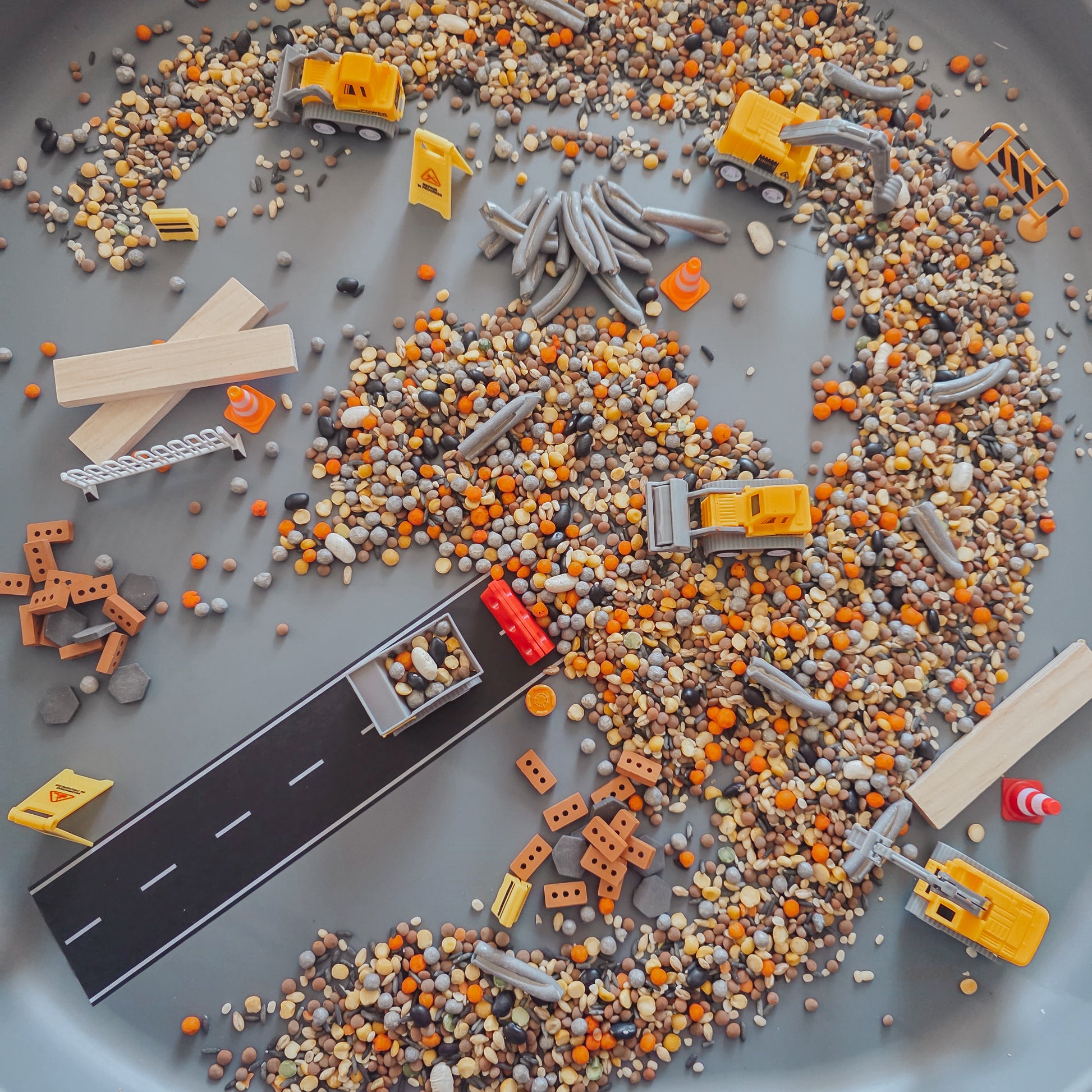 Construction Mayhem a pour and play construction theme that includes plastic vehicles, wood, bricks, plastic themed pieces and paper tape. Colours may vary to my photos as products are photographed in lighted rooms.