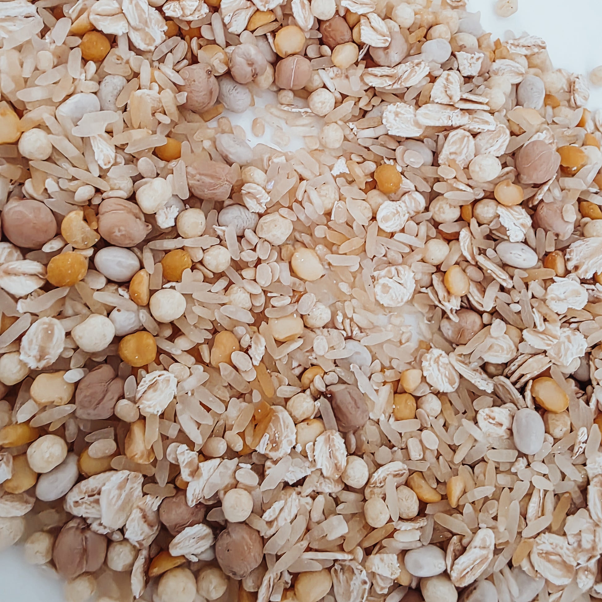 Ingredients: Long Grain Rice, split peas, beans, cous cous pearls, oats, urid dahl, chickpeas, Food Dye and Vinegar