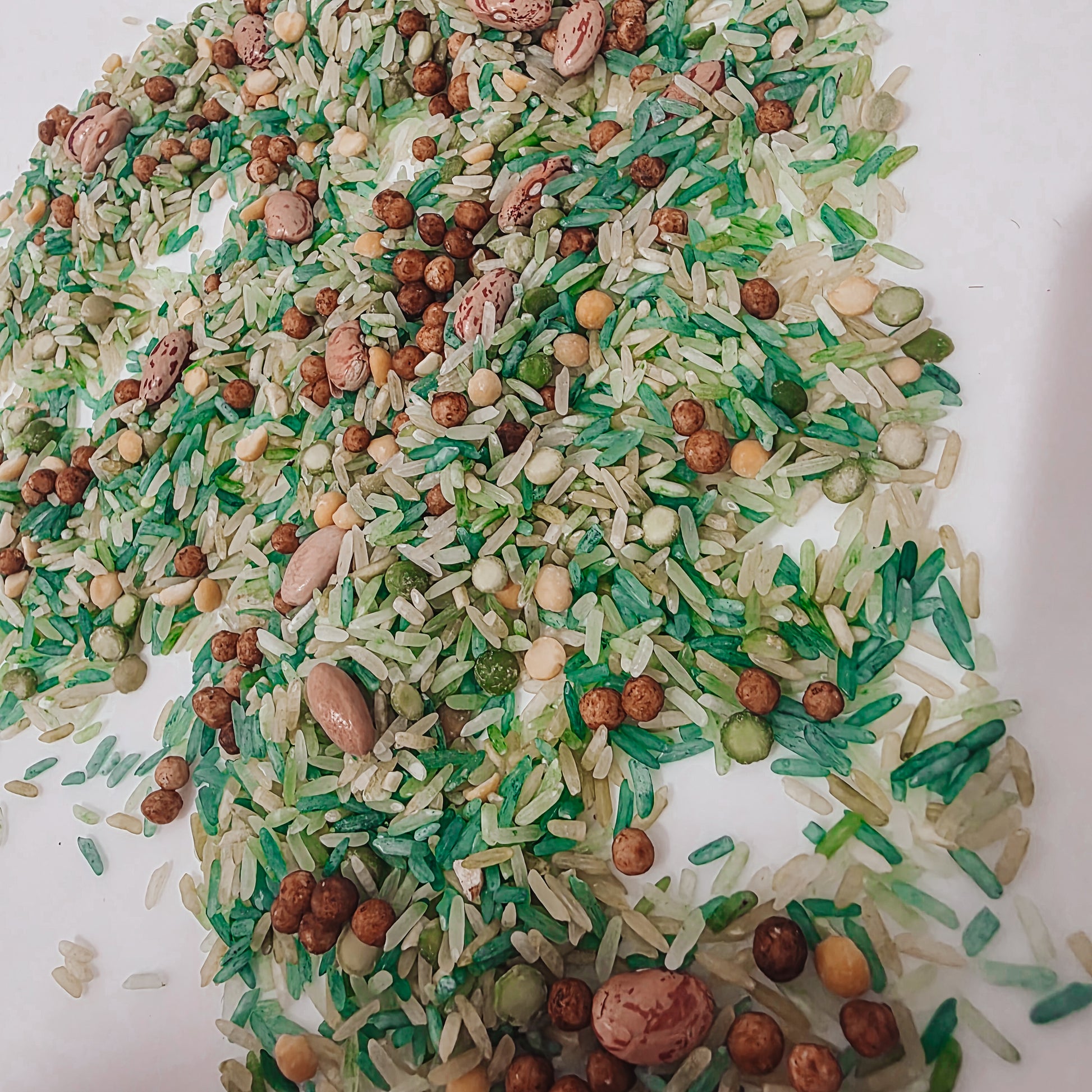 Ingredients: Long Grain Rice, split peas, couscous pearls, beans, Food Dye and Vinegar