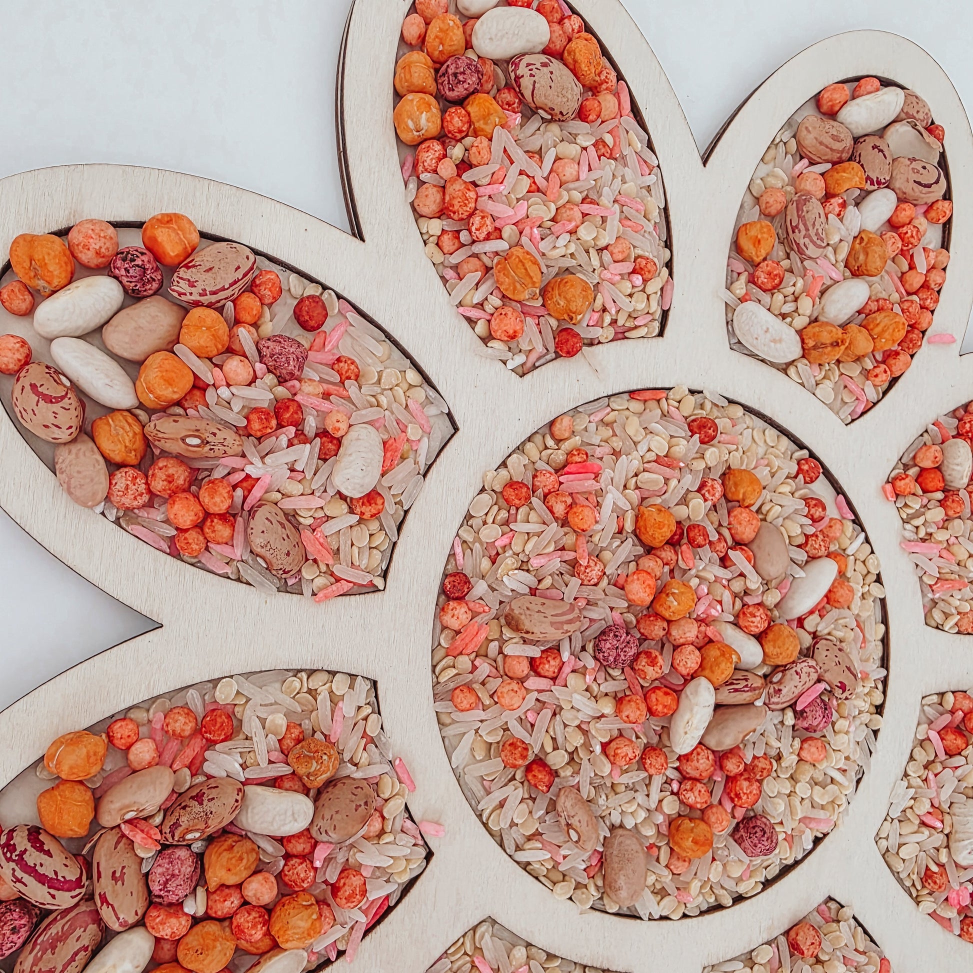 Ingredients: Long Grain Rice, couscous, dahl, chickpeas, beans, Food Dye and Vinegar