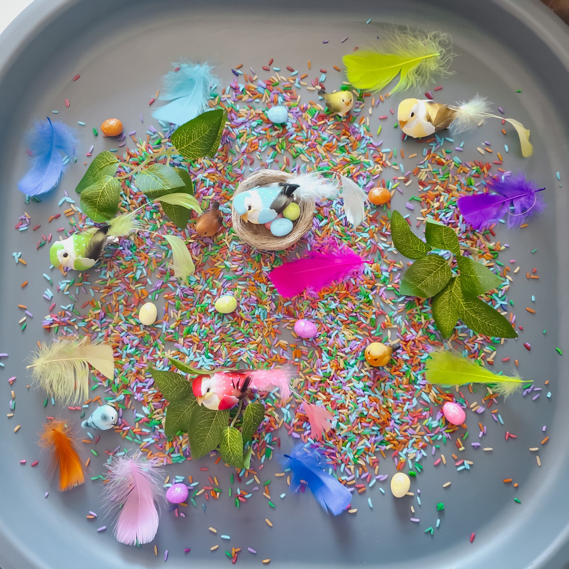 Rainbow Birds a pour and play construction theme that includes foam feathered birds, plastic leaves, wood nest, acrylic birds, foam glitter eggs and feathers. Colours may vary to my photos as products are photographed in lighted rooms.