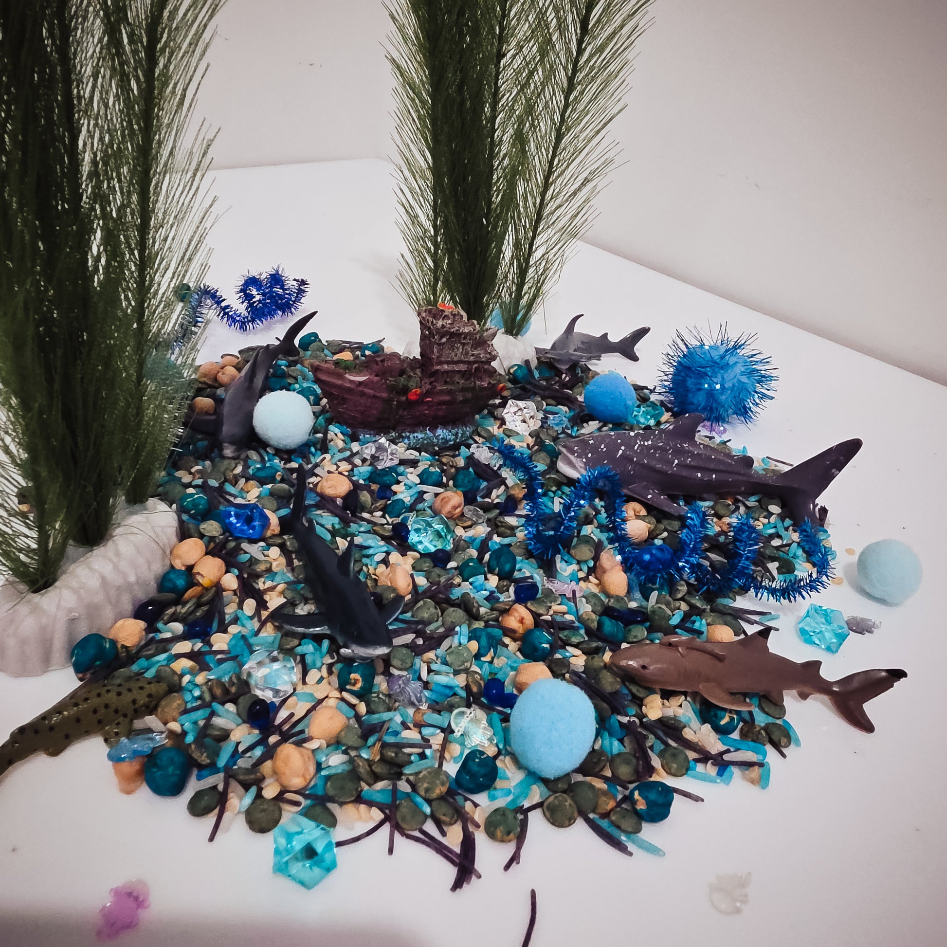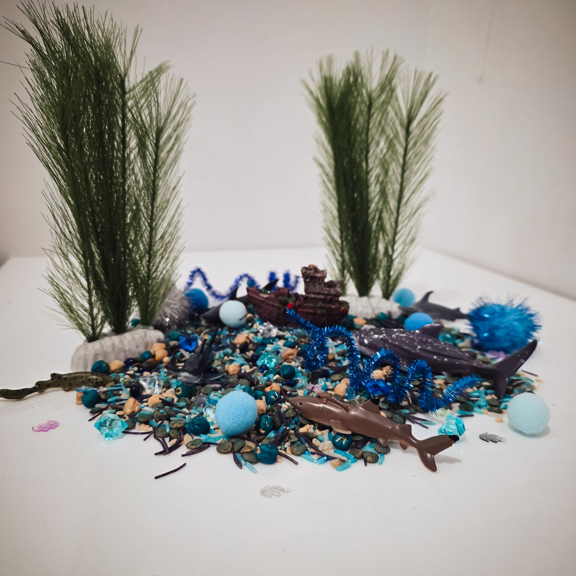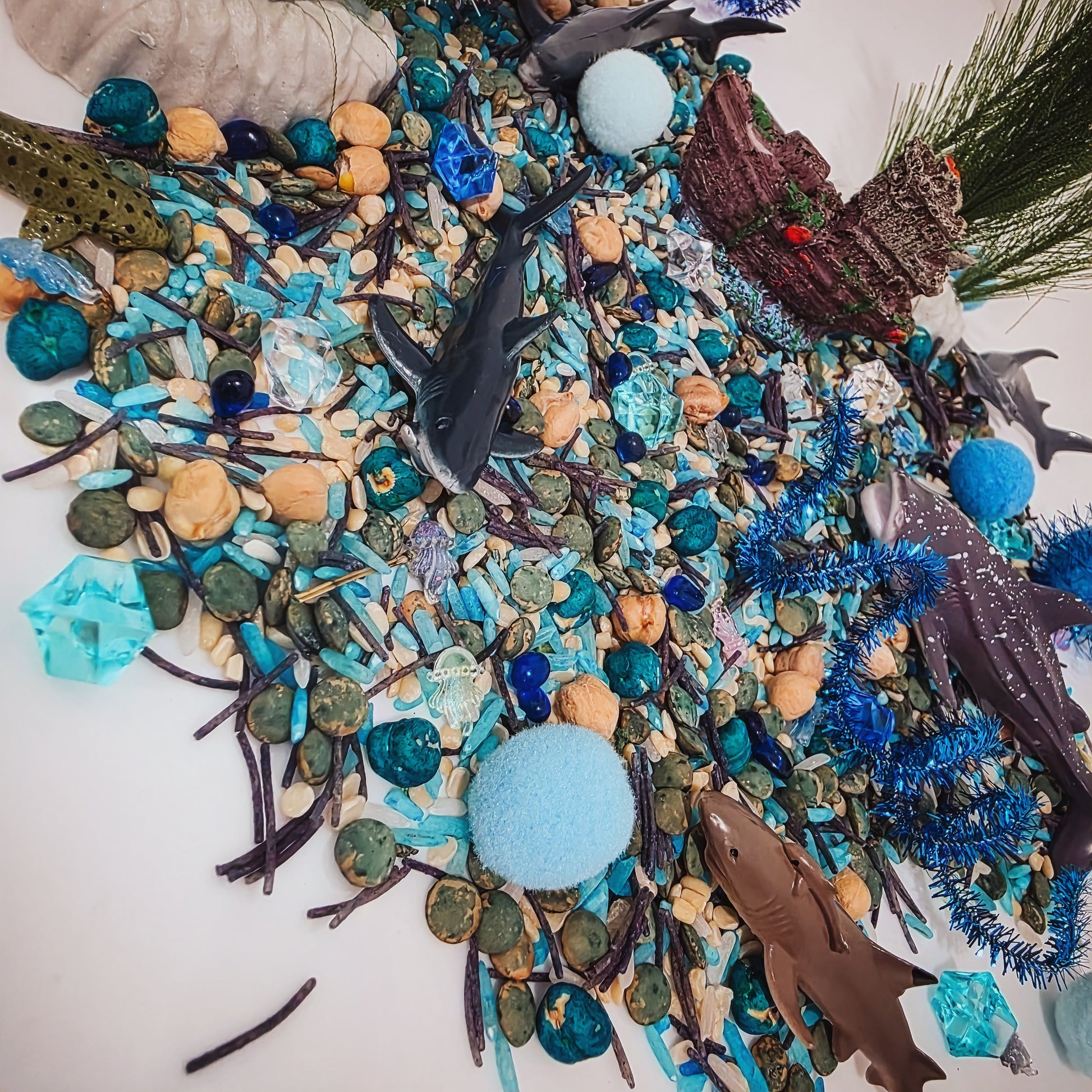 Shark Den is a pour and play shark theme that includes plastic sharks, material seaweed, blue gems, acrylic fish and jelly fish and random bits. Colours may vary to my photos as products are photographed in lighted rooms.