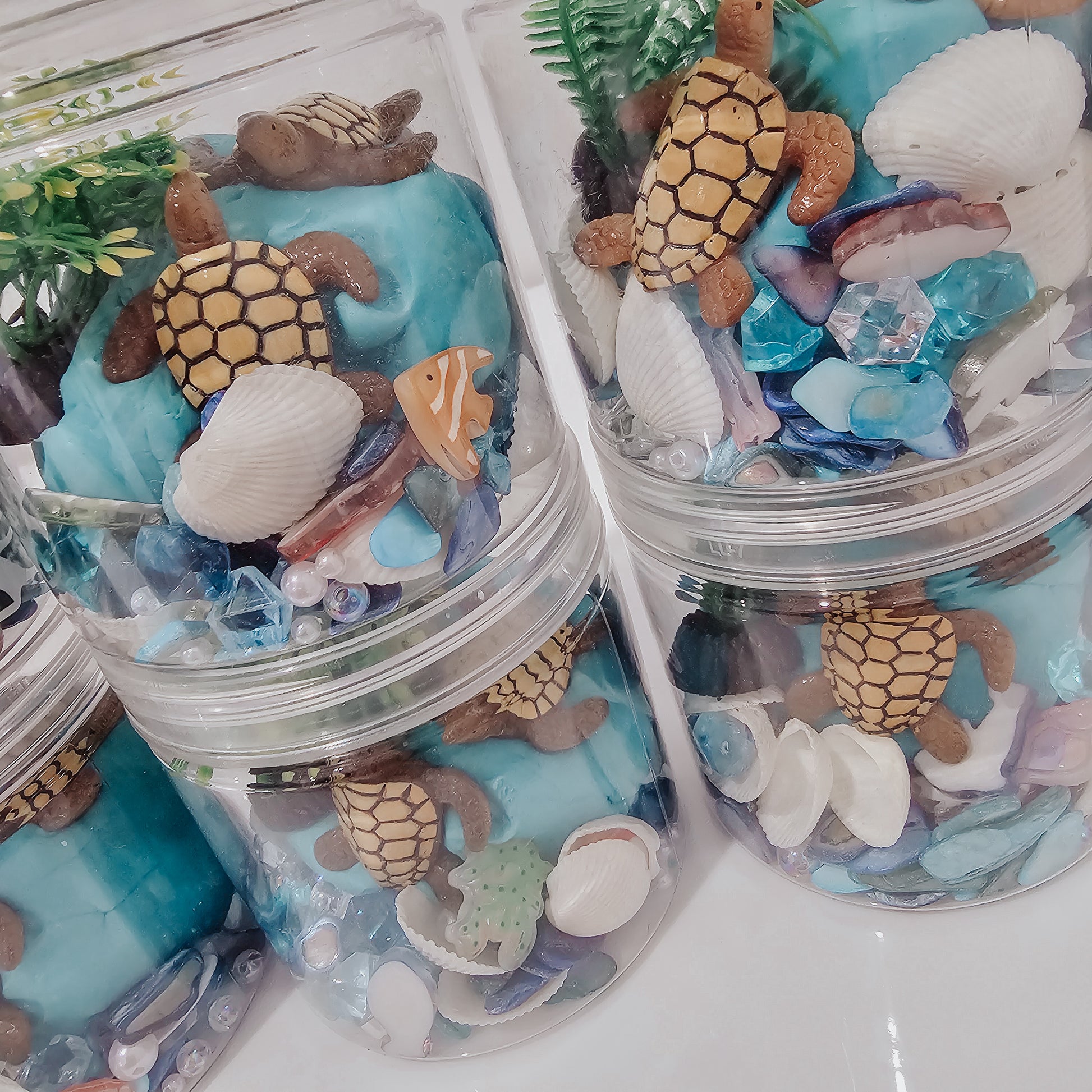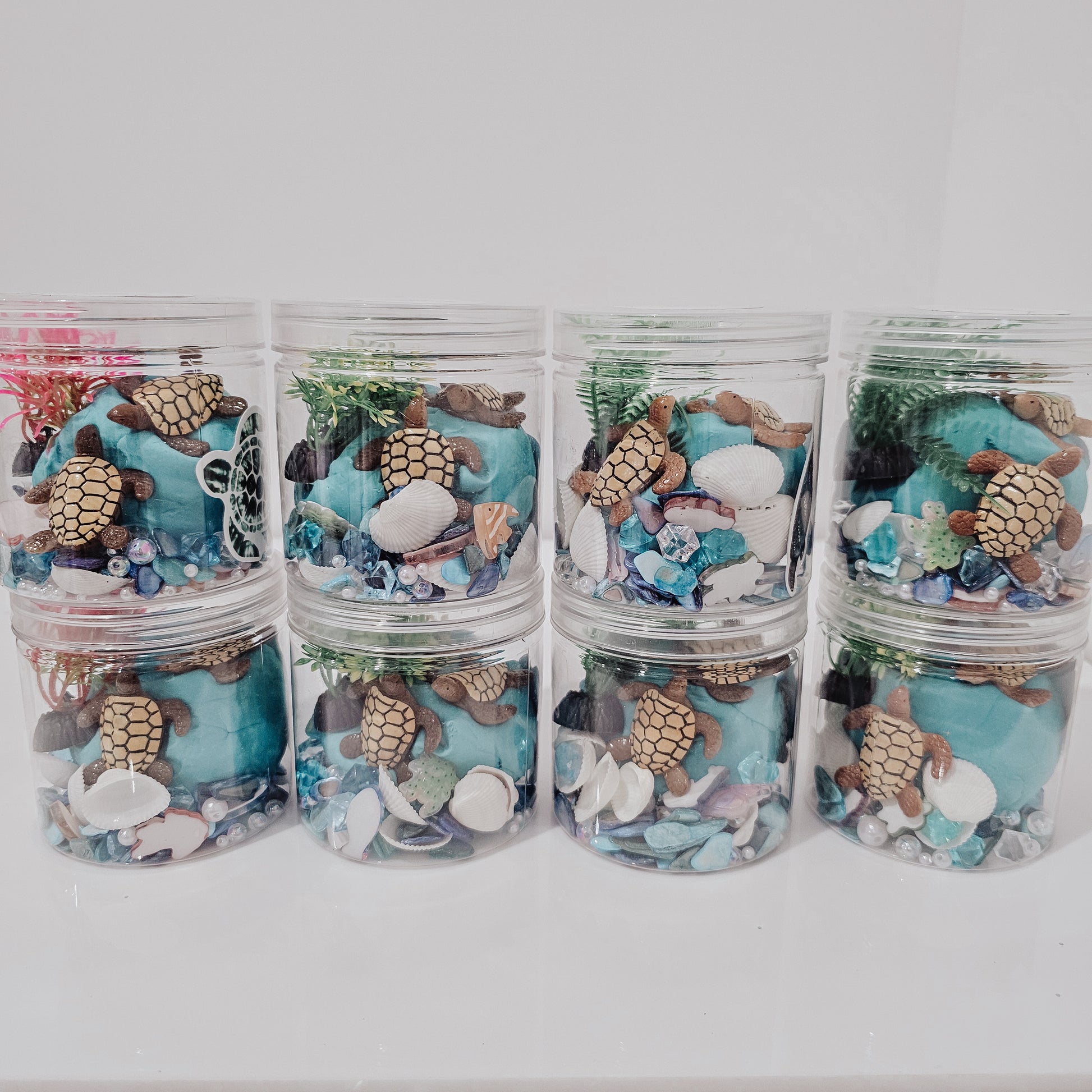 These mini tubs contain turtles, themed pieces and blue play dough.