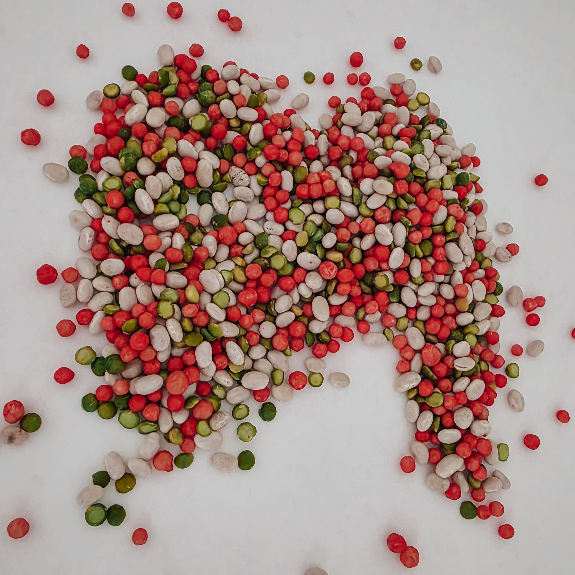 Ingredients: Long Grain Rice, split peas, beans, cous cous pearls, Food Dye and Vinegar